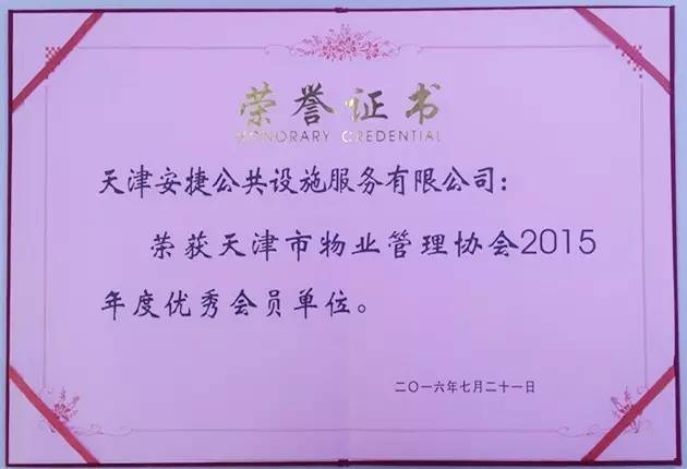 安捷榮獲天津市物業(yè)管理協(xié)會(huì)2015年度優(yōu)秀會(huì)員單位稱號(hào)