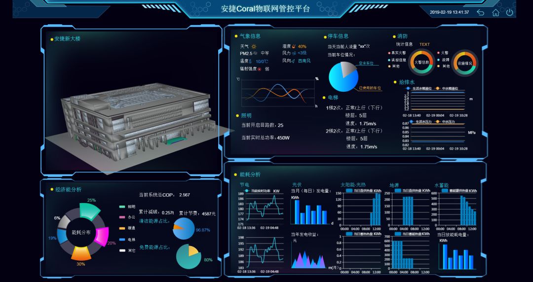 建筑模型信息系統(tǒng)(BIM)能夠?qū)⒏鱾€(gè)建筑元素建立起內(nèi)在的本身信息,并且整合建筑生命周期,使其能夠改良規(guī)劃、設(shè)計(jì)、建設(shè)、操作、和維護(hù)的流程之模型系統(tǒng),并且能夠充份的應(yīng)用在營(yíng)建工程上面。安捷物聯(lián)能源互聯(lián)網(wǎng)大廈便是借助于BIM技術(shù)的優(yōu)勢(shì),在規(guī)劃階段進(jìn)行了日照、風(fēng)和熱負(fù)荷等模擬,在基本方案的基礎(chǔ)上進(jìn)行BIM正向設(shè)計(jì),同時(shí)以第二代物聯(lián)網(wǎng)大數(shù)據(jù)管控Coral平臺(tái)為核心,秉承“先節(jié)費(fèi),再節(jié)能”的運(yùn)營(yíng)原則,完成能源多項(xiàng)流轉(zhuǎn)的實(shí)時(shí)監(jiān)測(cè)、動(dòng)態(tài)策略的下發(fā)調(diào)整,進(jìn)而實(shí)現(xiàn)能源的最合理配給。