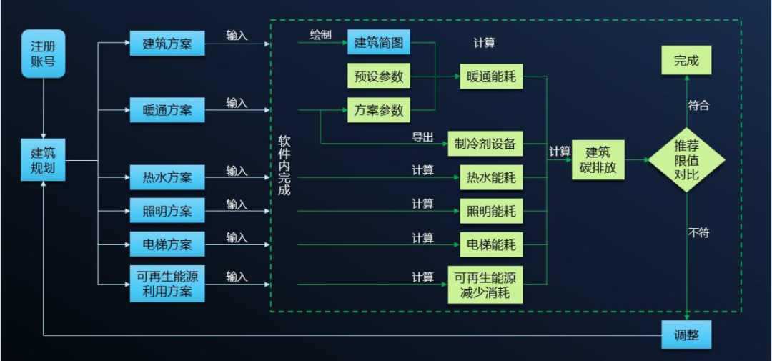 用戶在軟件中輸入建筑方案、暖通方案、熱水方案、照明方案、電梯方案和可再生能源利用方案,軟件會計算得出各個系統(tǒng)能耗值,再根據(jù)碳排放因子庫,計算得出建筑碳排放量,并將計算結果做圖形化展示和導出,使用戶能夠在建筑規(guī)劃階段預估建筑能耗和碳排放。
