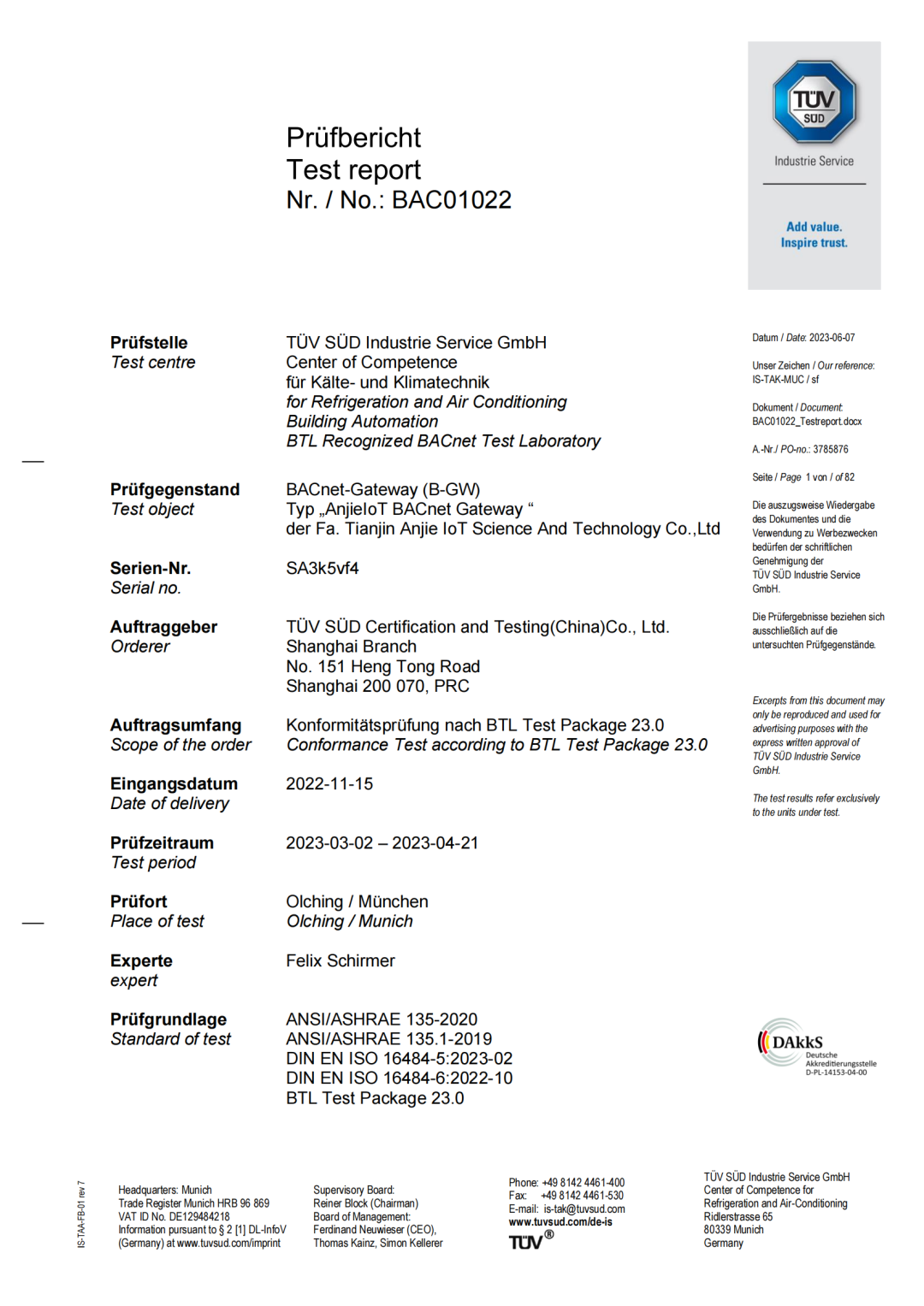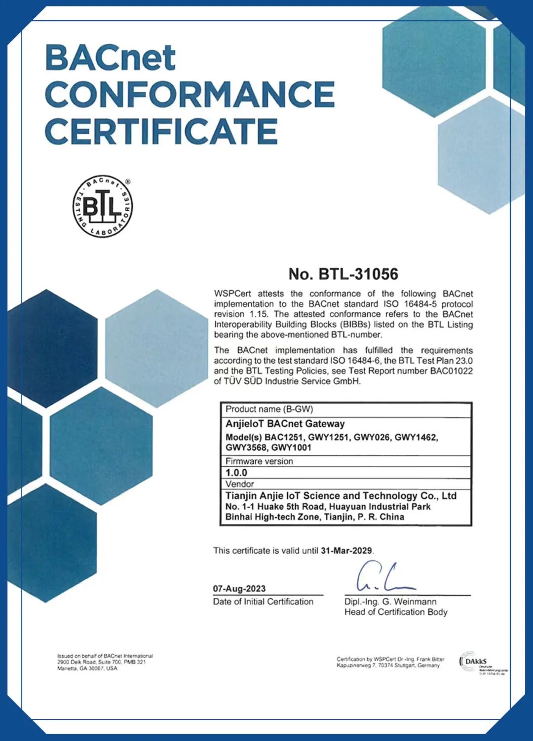 近日,由天津安捷物聯(lián)科技股份有限公司自主研發(fā)設(shè)計的GWY系列智能網(wǎng)關(guān)產(chǎn)品成功通過BTL(BACnet Testing Laboratories )認(rèn)證,該項認(rèn)證是國際樓宇自控領(lǐng)域的第一權(quán)威認(rèn)證。