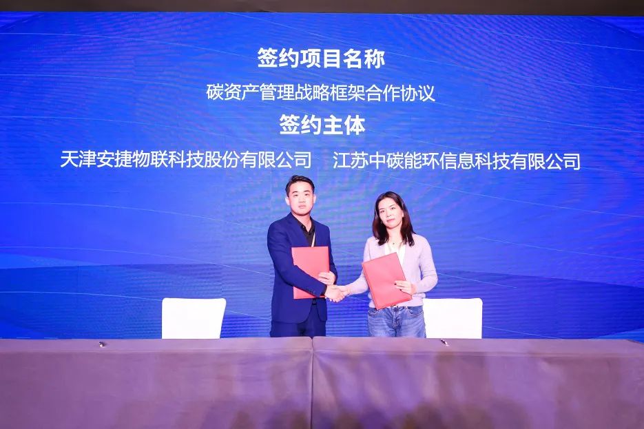 會(huì)上,天津安捷物聯(lián)科技股份有限公司與江蘇中碳能環(huán)信息科技有限公司簽署戰(zhàn)略合作協(xié)議,雙方將共建碳資產(chǎn)管理合作項(xiàng)目,共同為全國(guó)高耗能企業(yè)提供優(yōu)質(zhì)的碳資產(chǎn)管理服務(wù)。